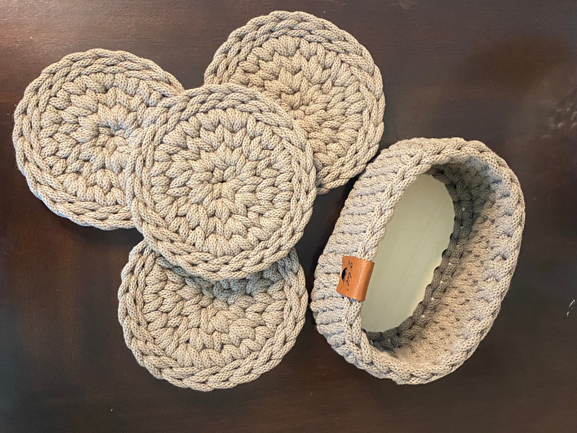 Coaster set includes four 5" diameter coasters with a matching holder made of cotton braided cord. Holder also has a wood base. Cotton cord won't scratch your table like other coasters and are safe with children on your table. Generous size for large cups or glasses.