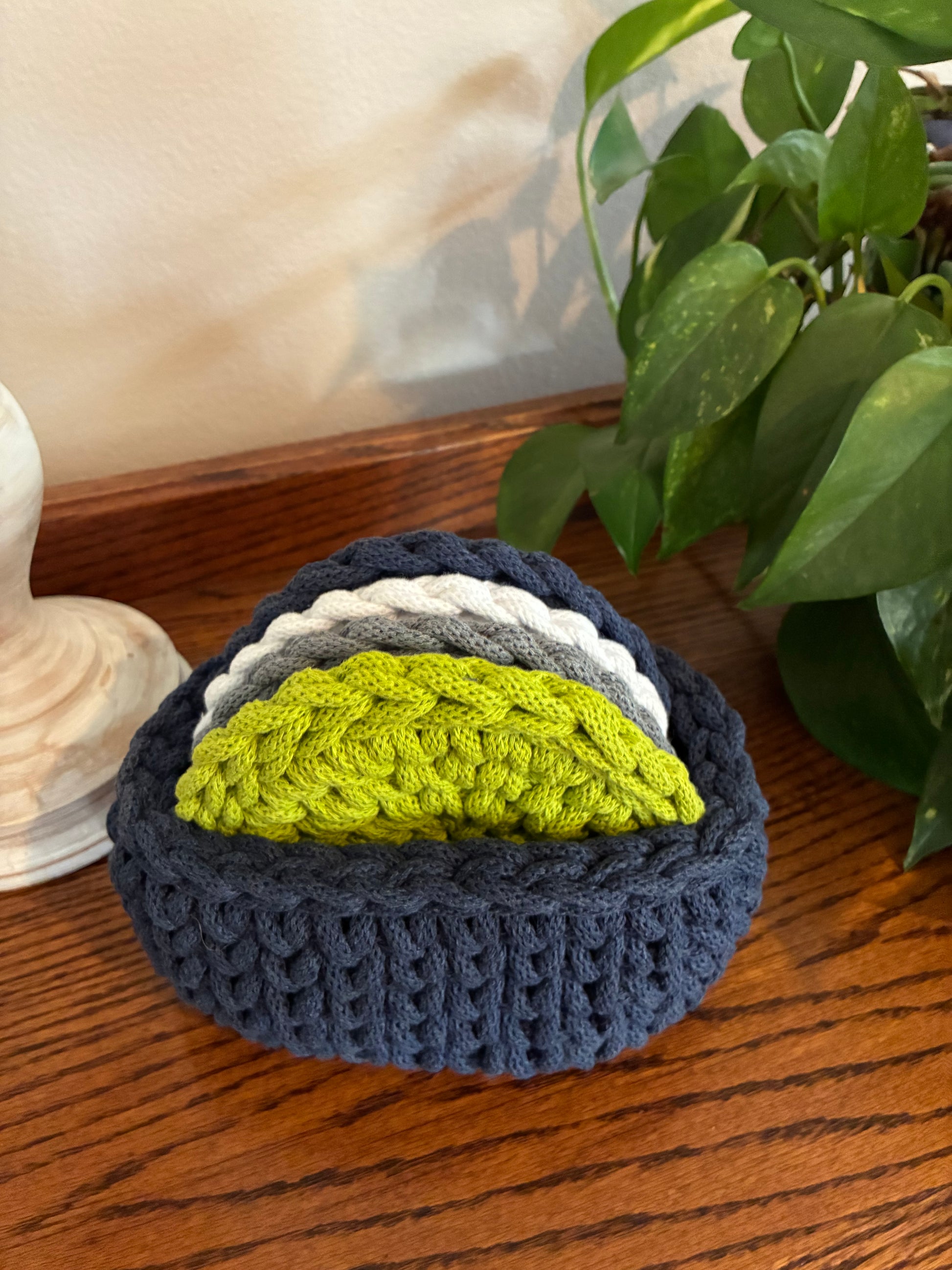 Coaster set includes four coasters and coaster holder in Seattle Seahawk themed colors. One coaster in each color: lime green, blue, gray and white. Celebrate your favorite team in style.