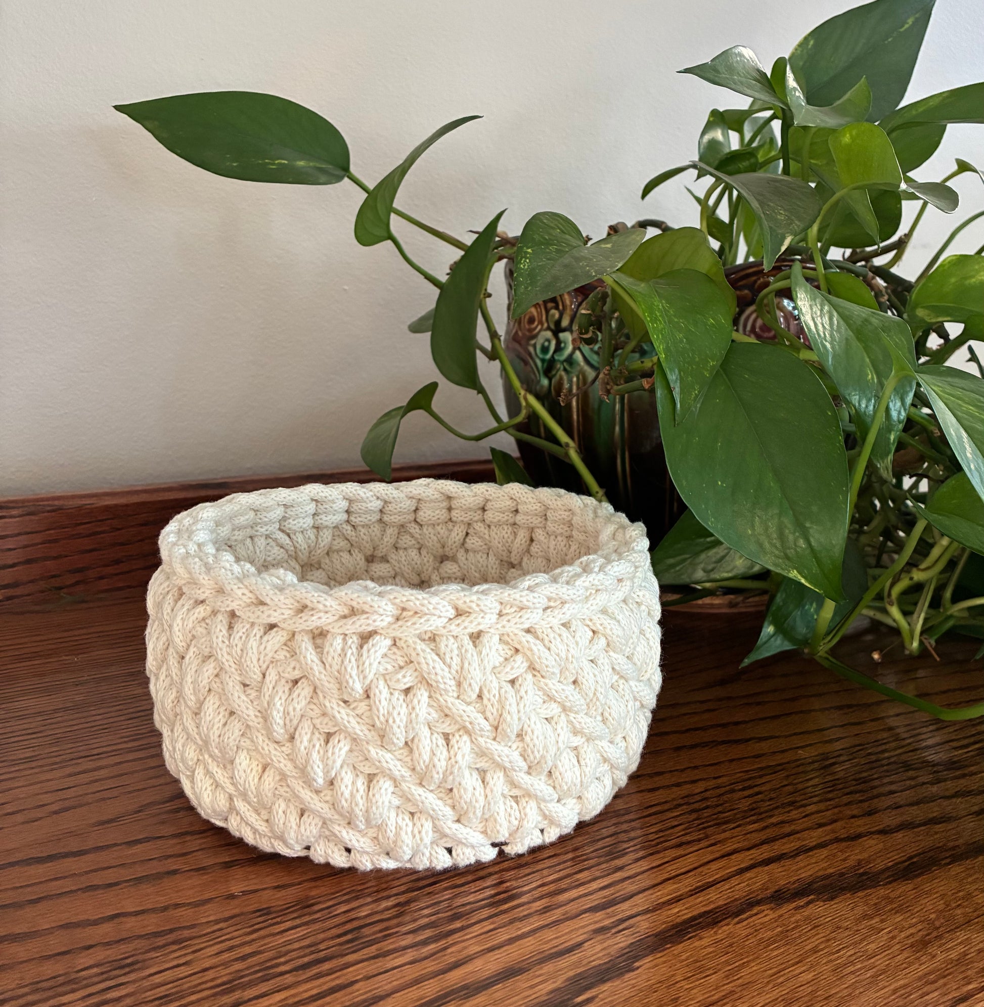 Crocheted 6” basket made with cotton braided macrame cord and a wood base. This class is beginner friendly and also made for an experienced crocheter wanting to learn something new.