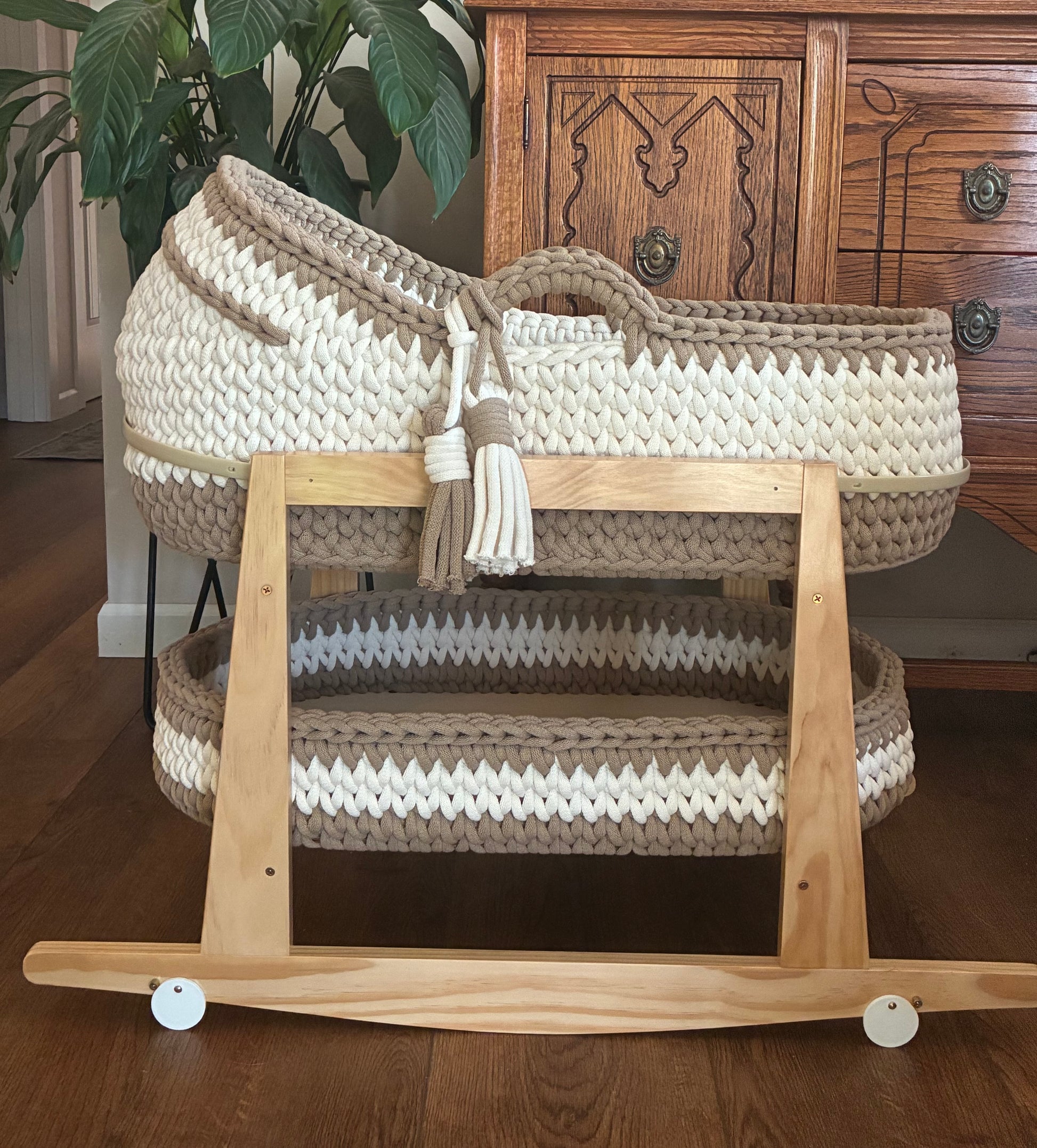 Hooded Moses basket is 30" long x 15" wide x 8" high (not including handle or hood) and is made of 9MM braided cotton cord with a birch wood base for extra durability. Mattress pad, changing basket, and stand available separately.