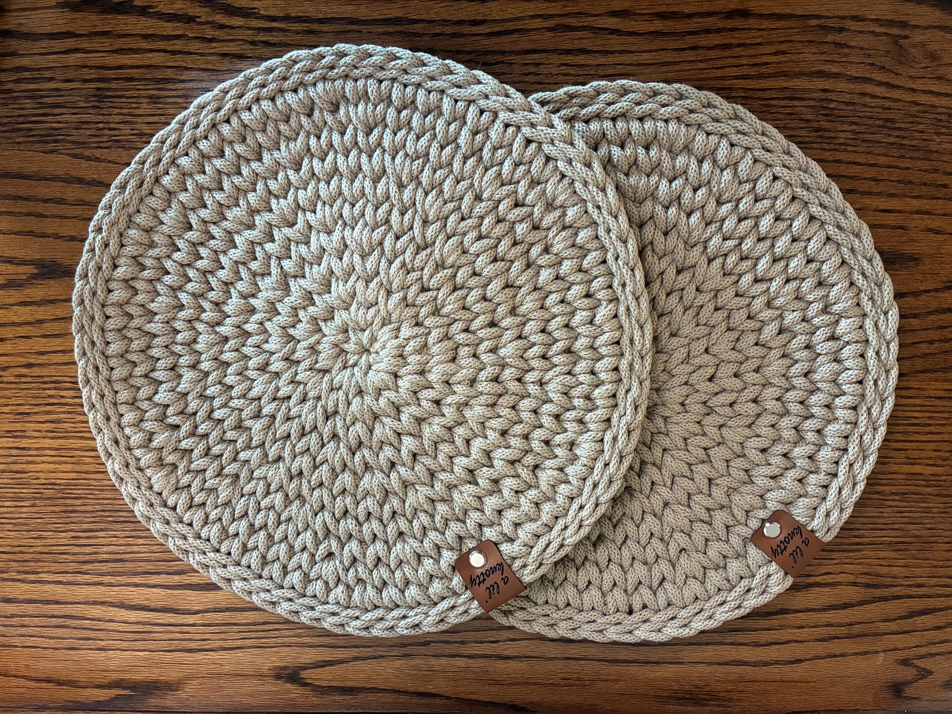 Round place mat is 12" in diameter and made of cotton braided cord. Our place mat adds beauty to your table setting while protecting your table from heat and spills. Set includes two place mats.
